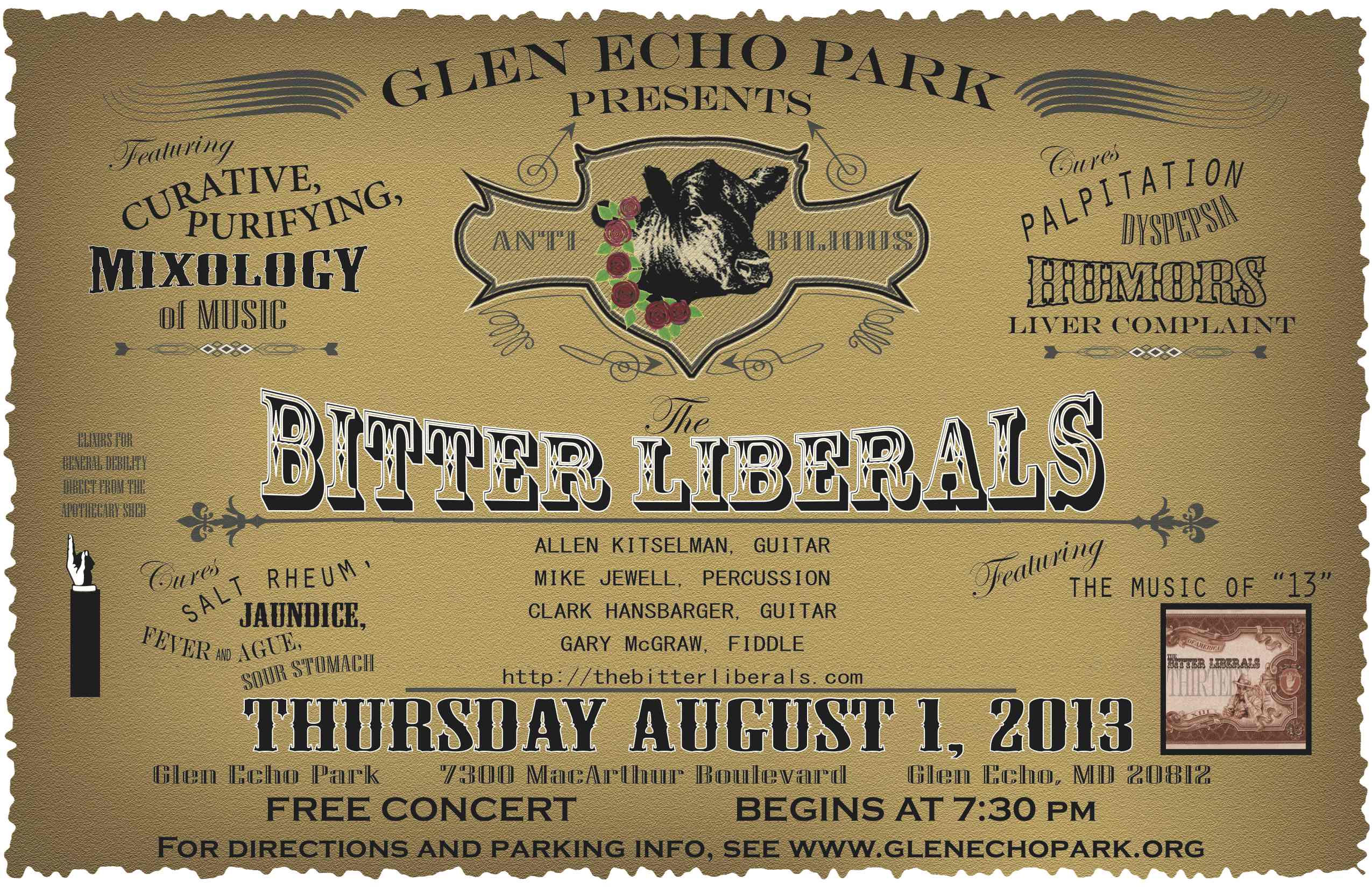 Well, the Bitter Liberals would love to have you and your urban friends join us for a special FREE concert at Glen Echo park on August 1st. Tell everyone you know in Washington to come hear us (especially those Tacoma Park people)!