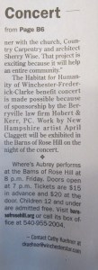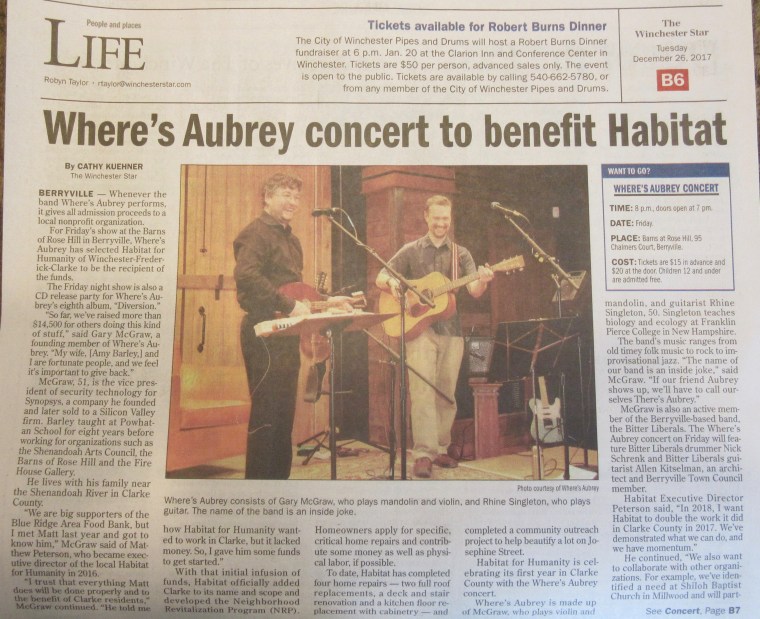 Tuesday’s Winchester Star (12/26) included an article about Friday’s upcoming Where’s Aubrey concert (featuring three of five Bitter Liberals on stage). Where’s Aubrey performs all original music, with Rhine Singleton on guitar and Gary McGraw on violin and mandolin.