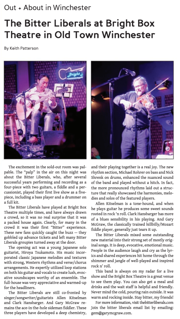 Special thanks and whatever post-facto bribery is necessary for our friend Keith Patterson who wrote a great review of our recent SOLD OUT show at the Bright Box for the Clarke County Observer. We have so much fun playing these shows, that we almost forget to pay attention.