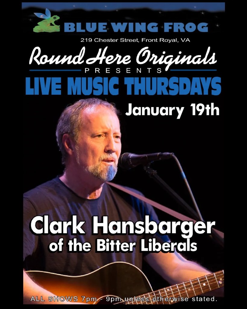 One of our two incredibly talented songwriters, Clark, will play a solo show featuring any number of songs written by and for the Bitter Liberals on Thursday the 19th of January 2023. The show is in Front Royal at 7pm at the Blue Wing Frog, 219 Chester Street. Call immediately for reservations as seating is limited: (540) 622-6175. Arrive early for good seats.